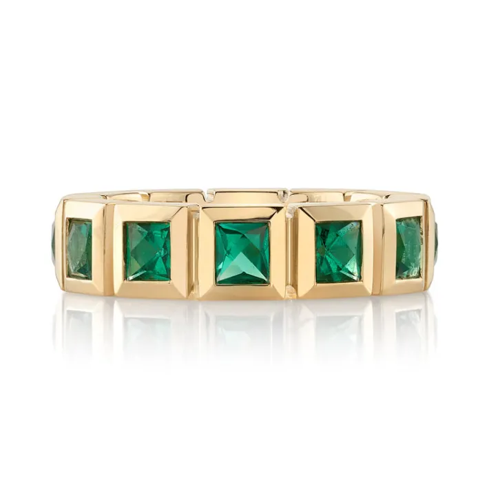Approximately 2.75ctw-3.00ctw square French cut gemstones bezel set in a handcrafted 18K yellow gold eternity band. Available with rubies, sapphires or emeralds.