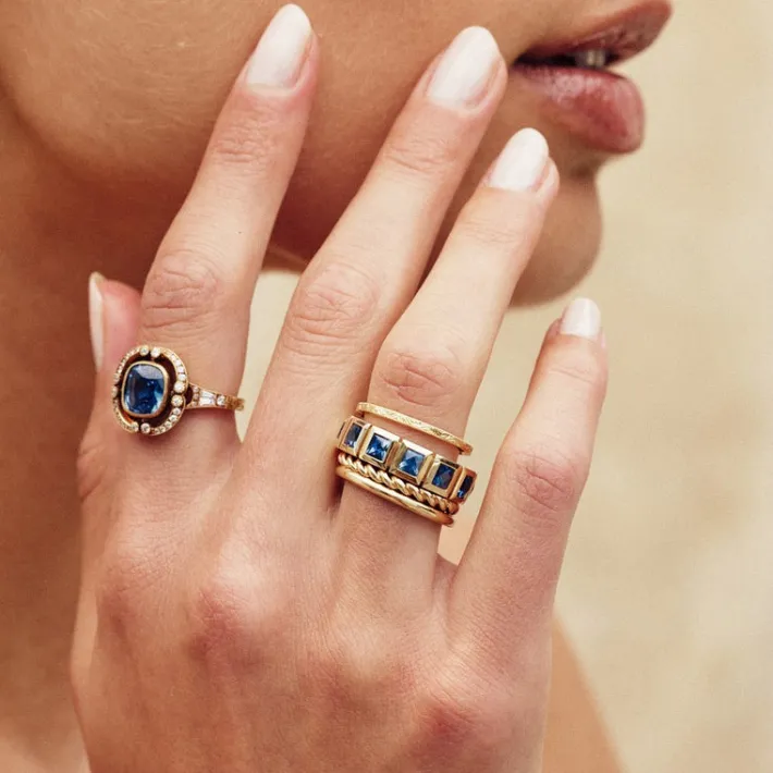 Approximately 2.75ctw-3.00ctw square French cut gemstones bezel set in a handcrafted 18K yellow gold eternity band. Avai…