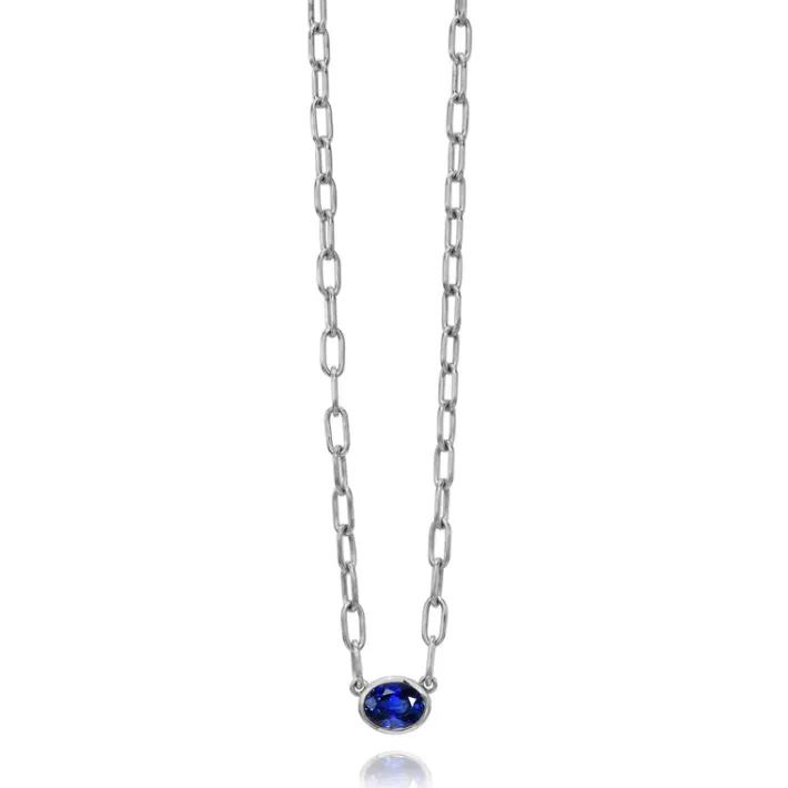 0.55ct oval cut blue sapphire bezel set on our handcrafted platinum Bond chain.Necklace measures 17″