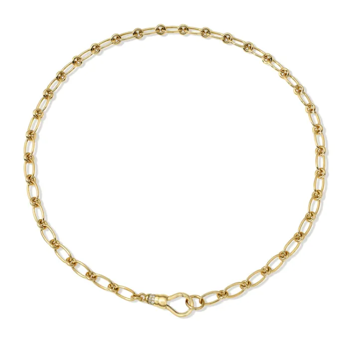 Handcrafted 18K yellow gold oval and round link necklace featuring a fob clasp with approximately 0.20ctw G-H/VS pavé set old European cut accent diamonds.