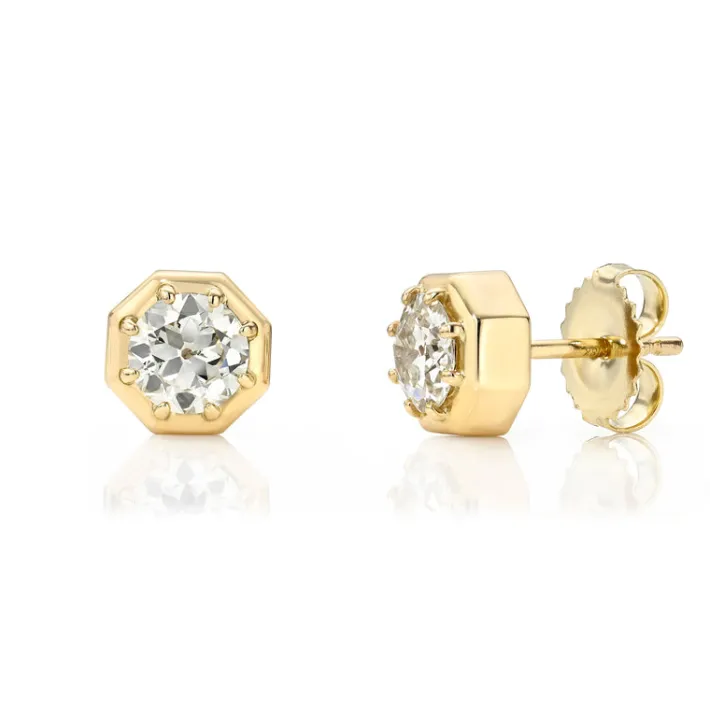 1.07ctw L/SI2 GIA certified old European cut diamonds prong set in handcrafted 18K yellow gold stud earrings.