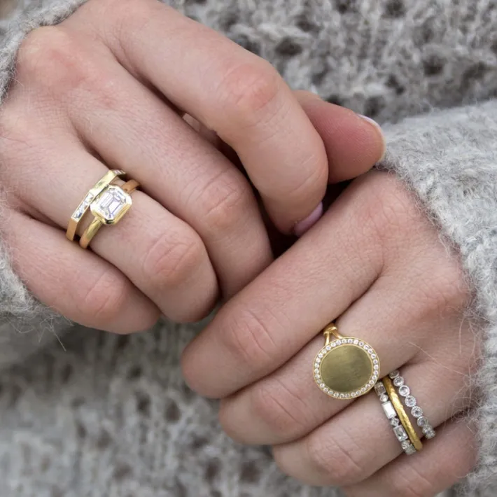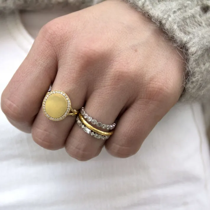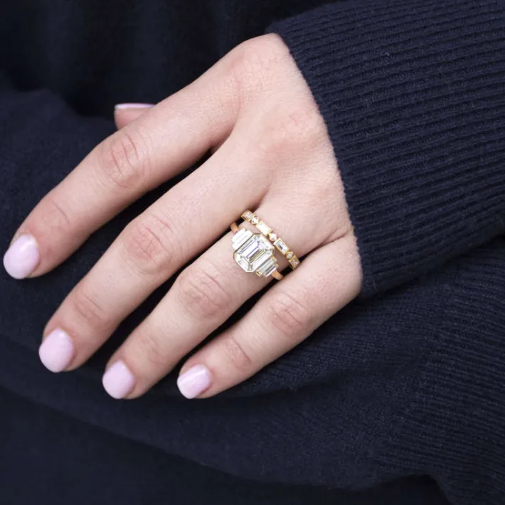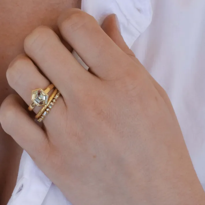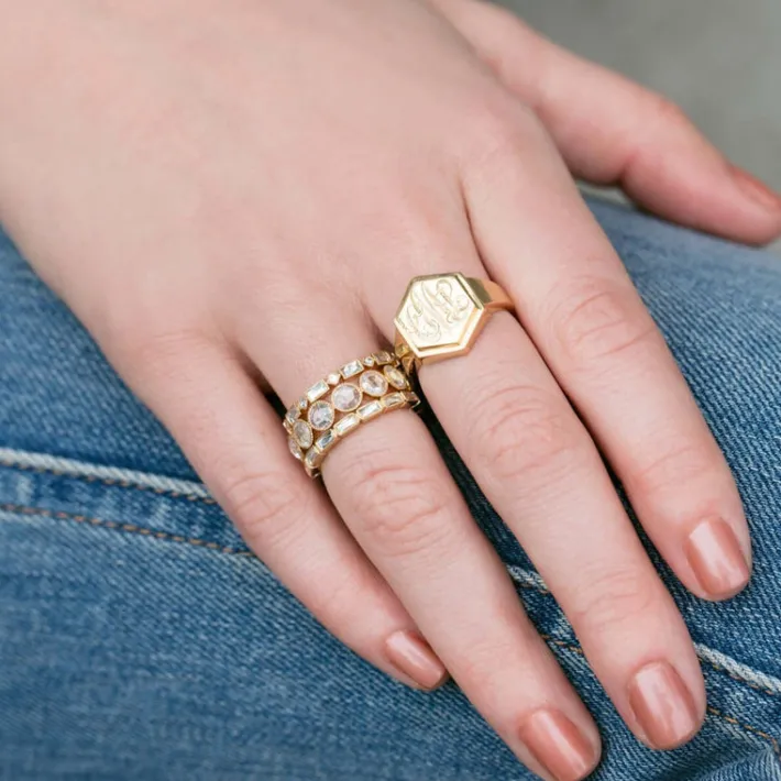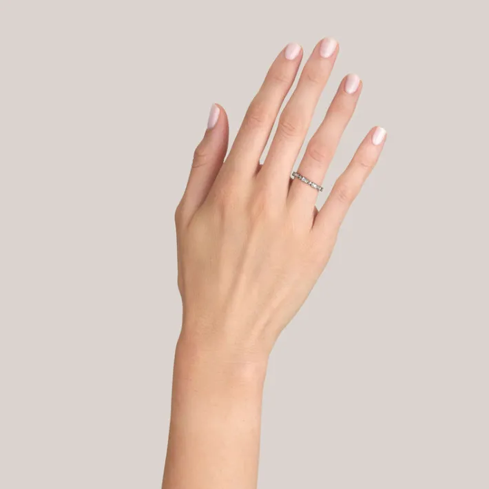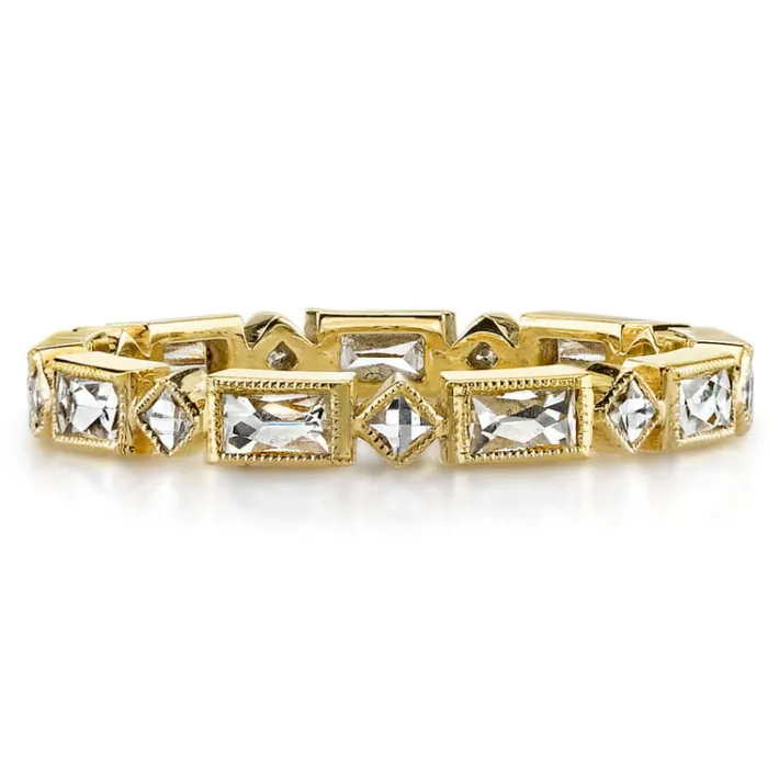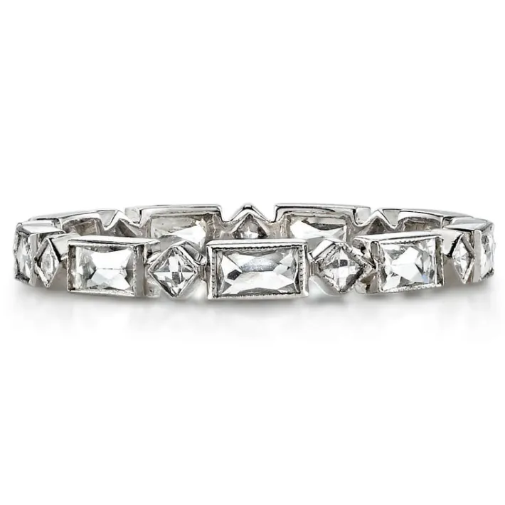 Approximately 0.80-1.00ctw square and rectangular French cut diamonds set in a handcrafted eternity band. Approximate ba…