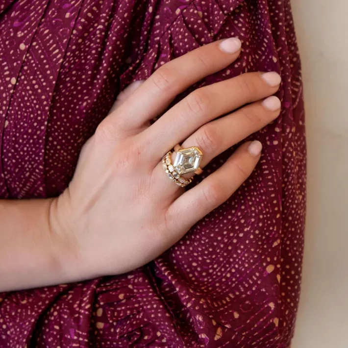 Approximately 0.80-1.00ctw square and rectangular French cut diamonds set in a handcrafted eternity band.