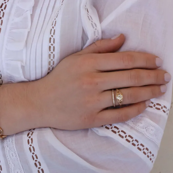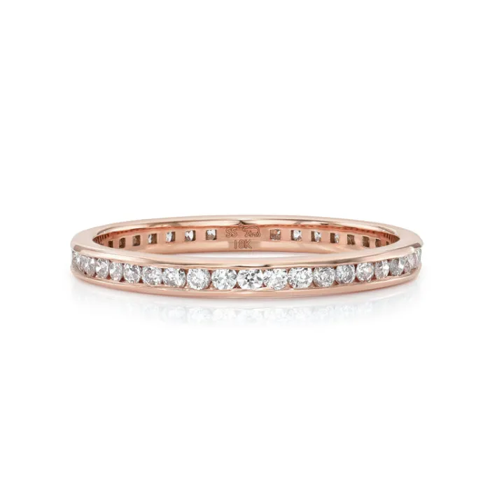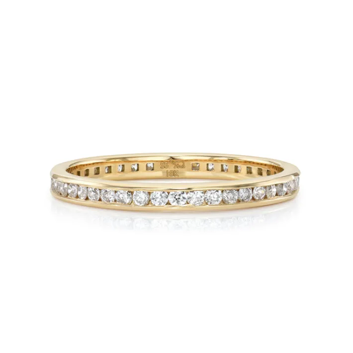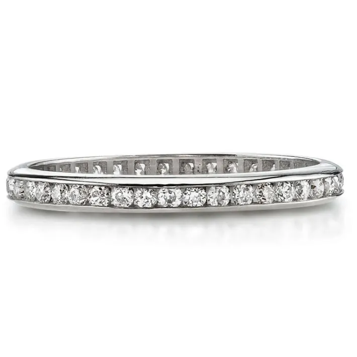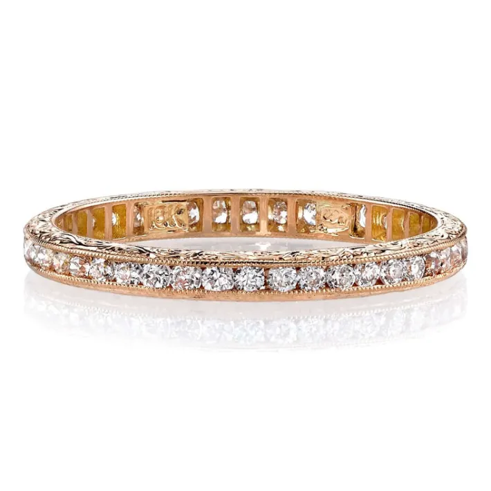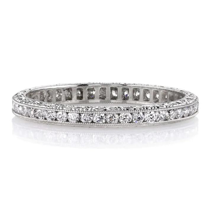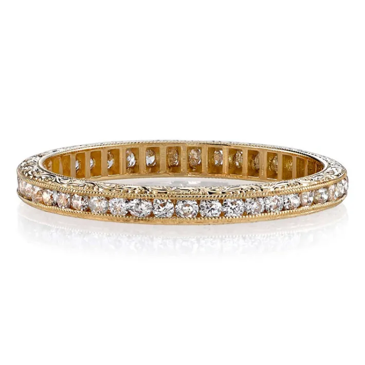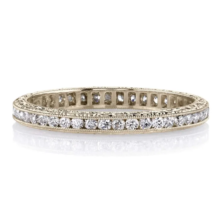 Approximately 0.40ctw old European cut diamonds channel set in a handcrafted eternity band. Available with polished or e…