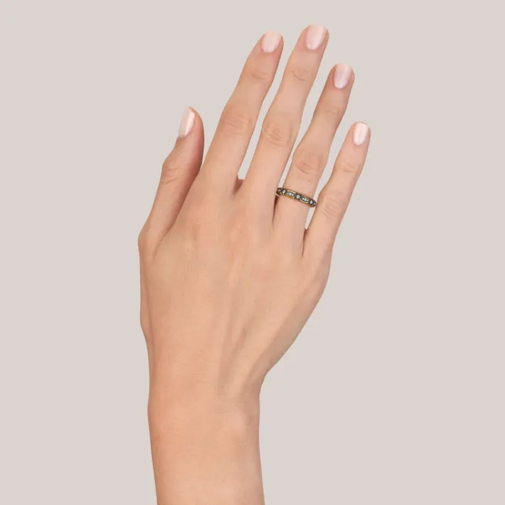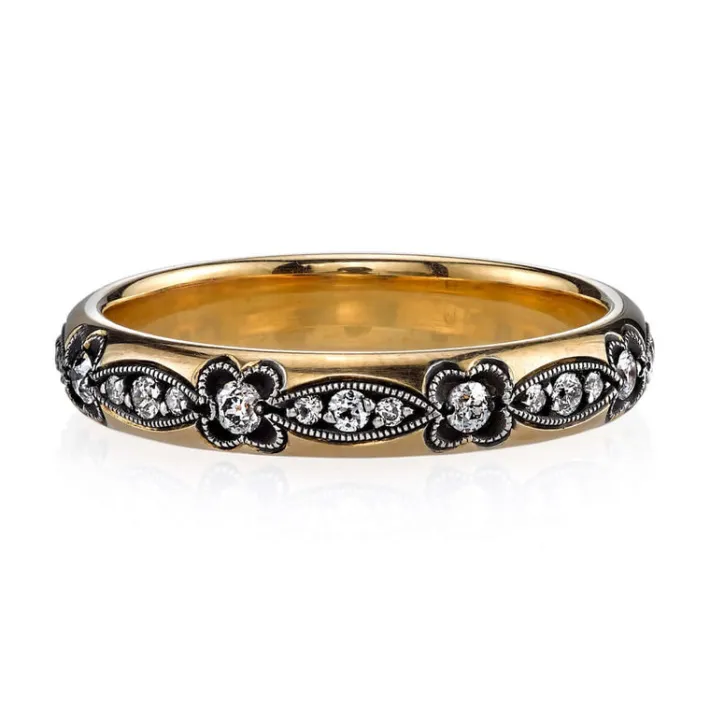Approximately 0.30ctw G-H/VS old European cut diamonds set in a handcrafted, oxidized 18K yellow gold and silver eternity band.