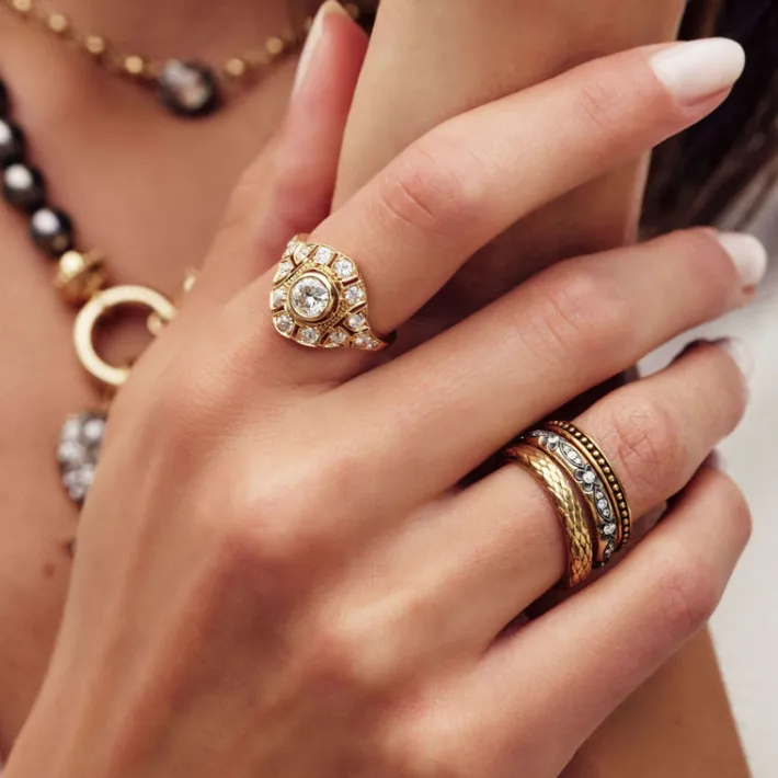 Approximately 0.30ctw G-H/VS old European cut diamonds set in a handcrafted, oxidized 18K yellow gold and silver eternit…