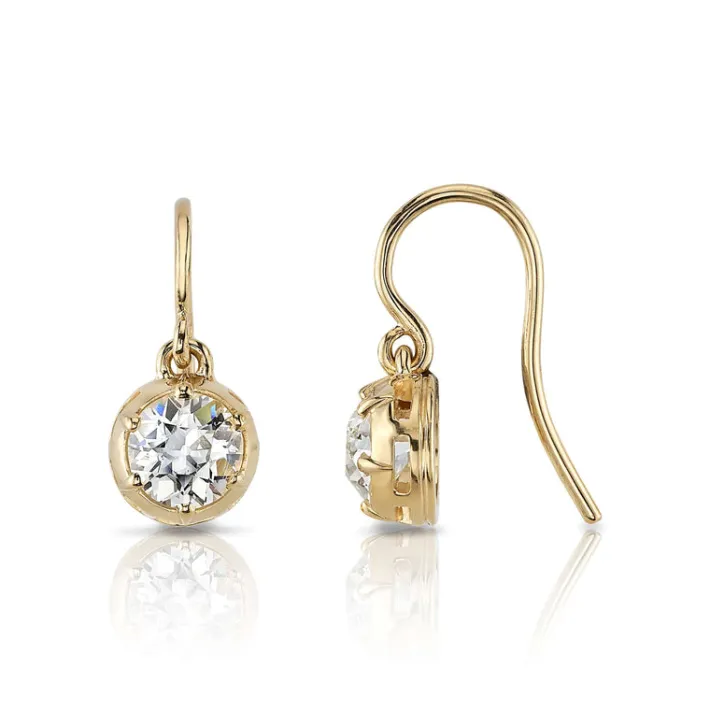 1.44ctw K-L/SI1 GIA certified antique cushion cut diamonds set in handcrafted 18K yellow gold drop mountings.