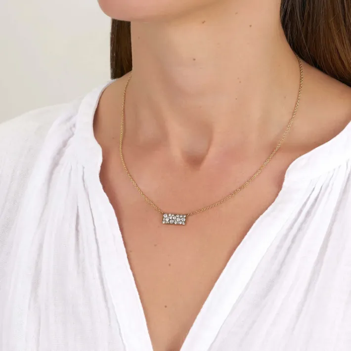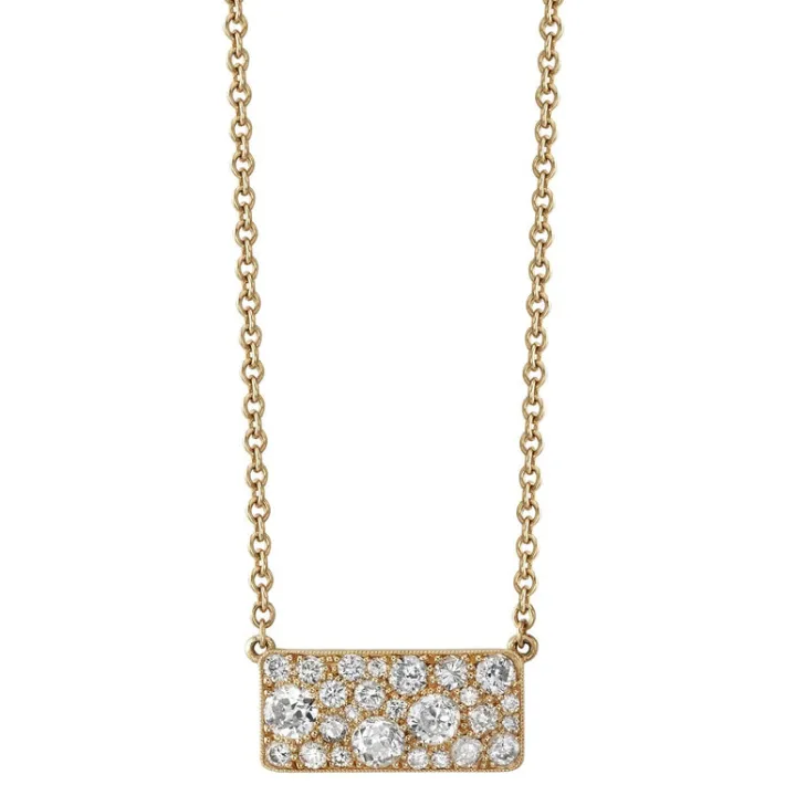 Approximately 0.80ctw varying old cut and round brilliant cut diamonds set in a handcrafted 18K yellow gold pendant. Necklace measures 18″. Price may vary according to total diamond weight. Available in an oxidized or polished finish.