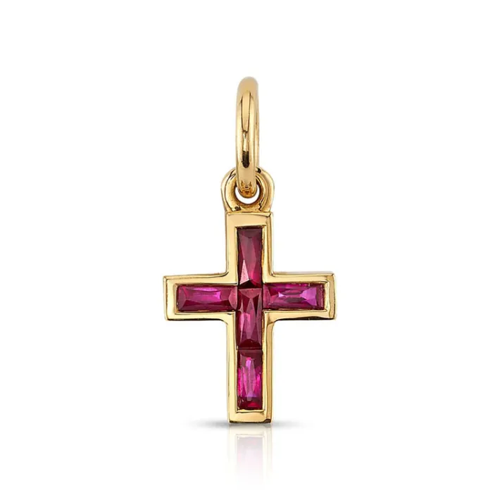Approximately 0.30ctw French cut gemstones set in a handcrafted 18K yellow gold cross. Cross measures 8.20mm x 9.80mm.