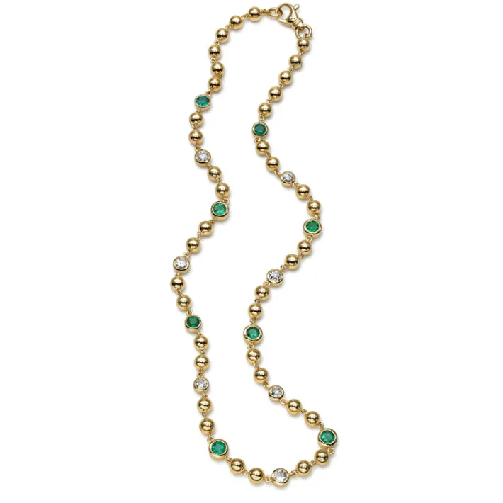 2.50ctw round cut green emeralds and 1.71ctw mixed cut diamonds set our handcrafted Mirella necklace.
