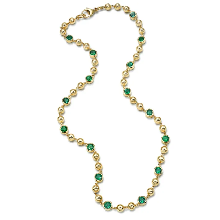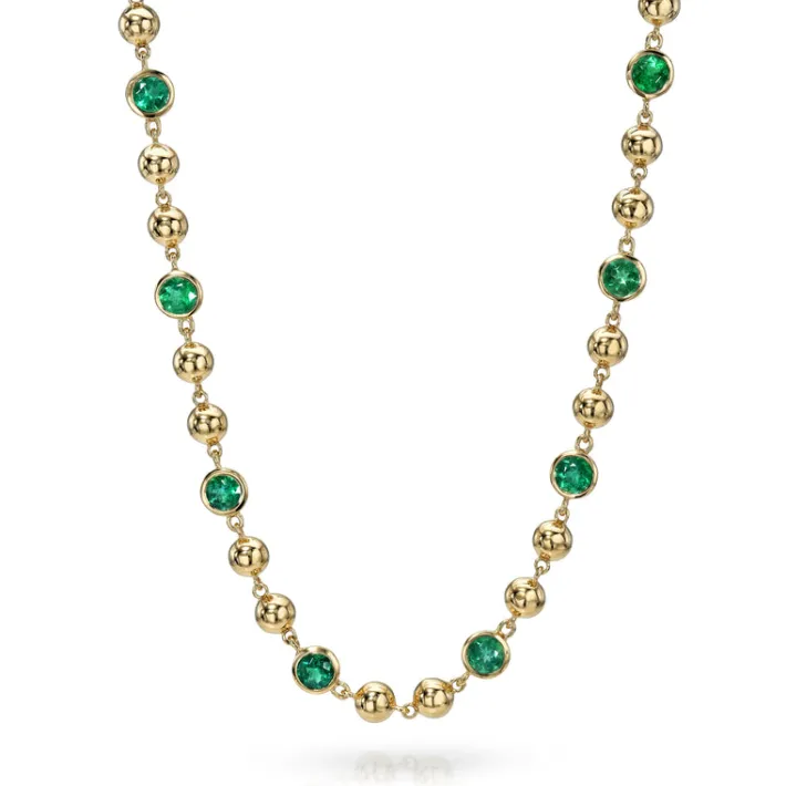 4.80ctw round cut green emeralds bezel set on our handcrafted 18K yellow gold Mirella necklace.