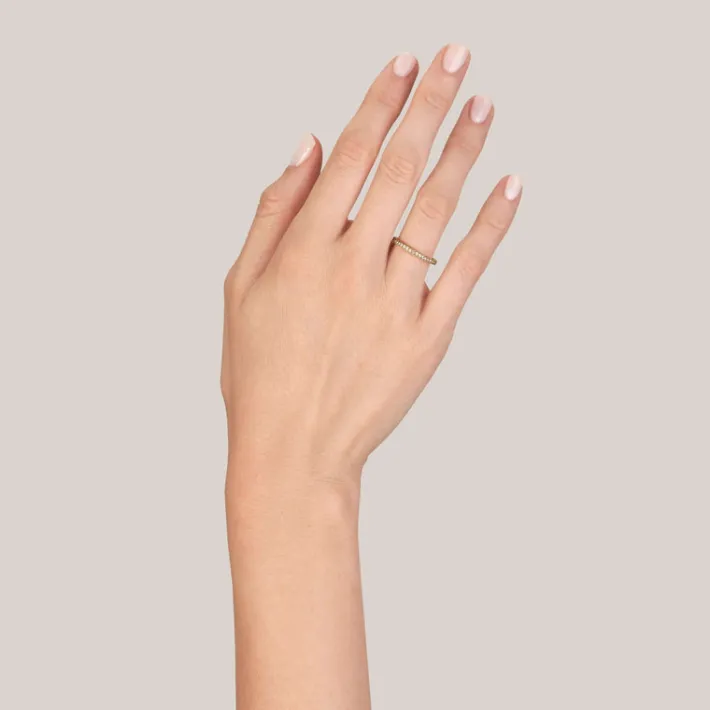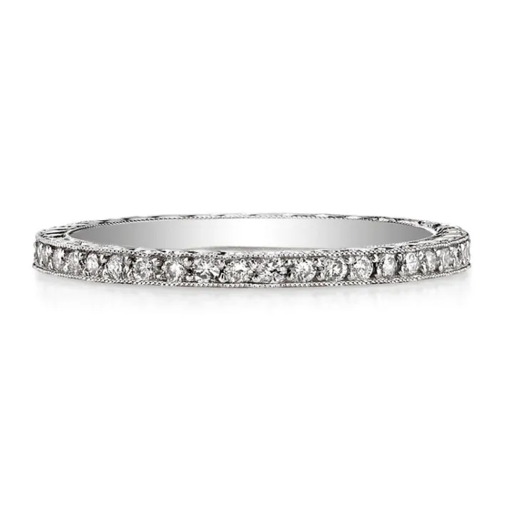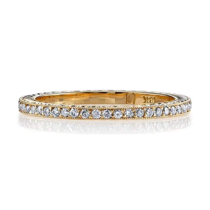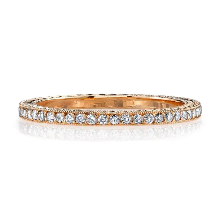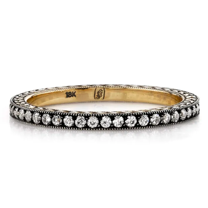 Approximately 0.40ctw G-H/VS old European cut diamonds pavé set in a handcrafted eternity band with engraved sidewalls.