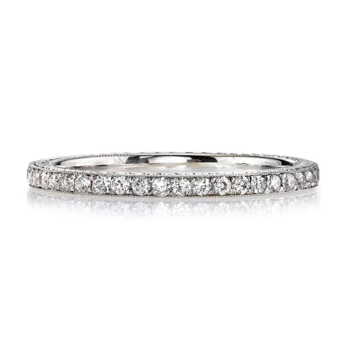 Approximately 0.40ctw G-H/VS old European cut diamonds pavé set in a handcrafted eternity band with engraved sidewalls….