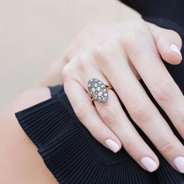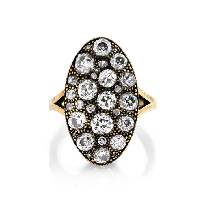 2.96ctw various old cut and round brilliant cut diamonds set in a handcrafted, oxidized 18K yellow gold mounting. Price …