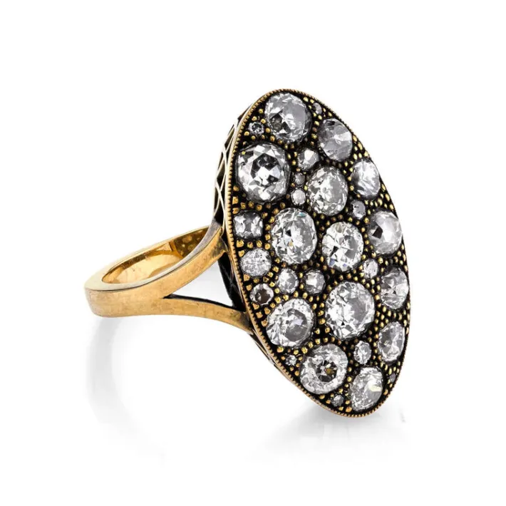 2.96ctw various old cut and round brilliant cut diamonds set in a handcrafted, oxidized 18K yellow gold mounting. Price may vary according to total diamond weight.
