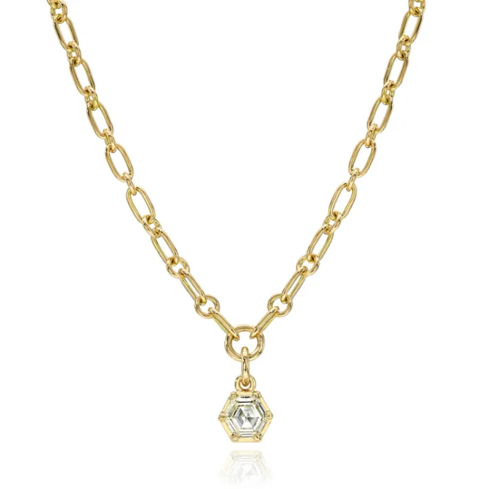 1.01ct K/VS1 GIA certified hexagonal step cut diamond prong set on our handcrafted 18K yellow gold Mini Lo chain.