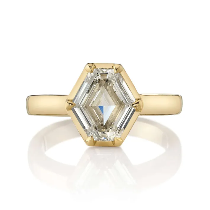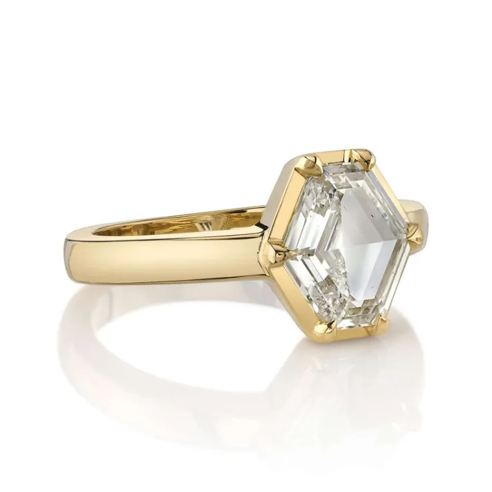 1.66ct O-P/SI2 GIA certified hexagonal cut diamond set in a handcrafted 18K yellow gold mounting.