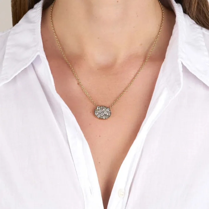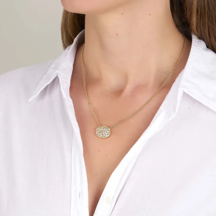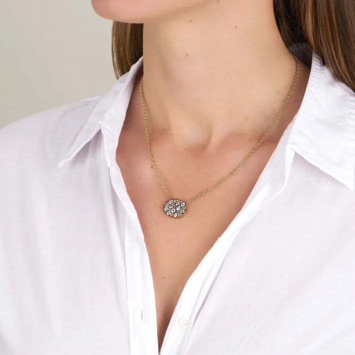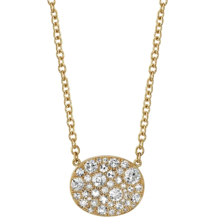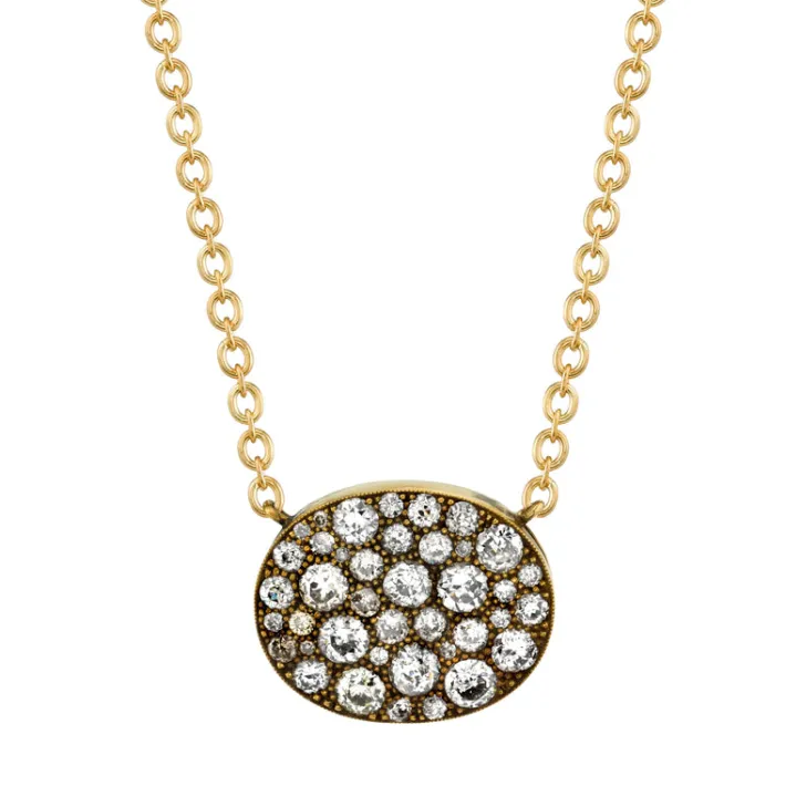 Approximately 1.80ctw various old cut and round brilliant cut diamonds set in a handcrafted 18K yellow gold pendant. Price may vary according to total diamond weight. Available in an oxidized or polished finish. Necklace measures 18″.