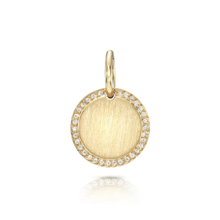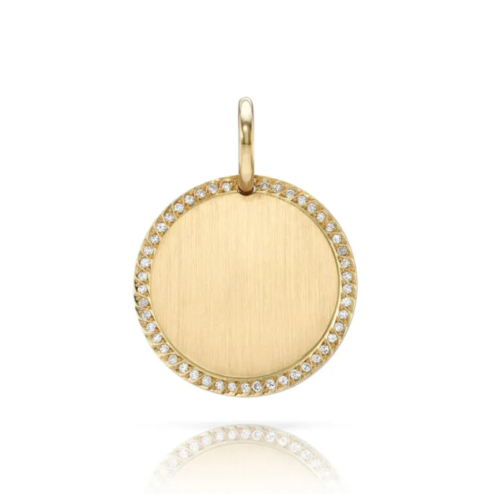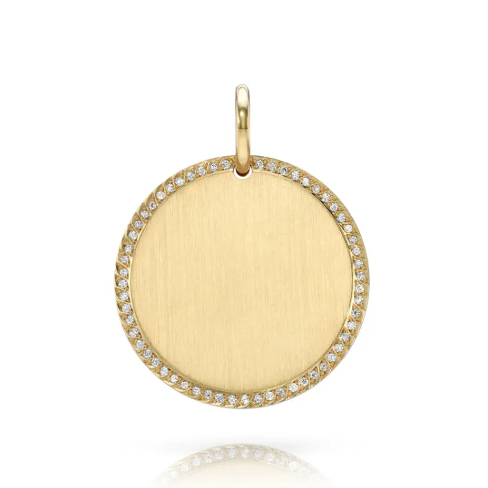 Old European cut diamonds pavé set in a handcrafted 18K yellow gold engravable round pendant.