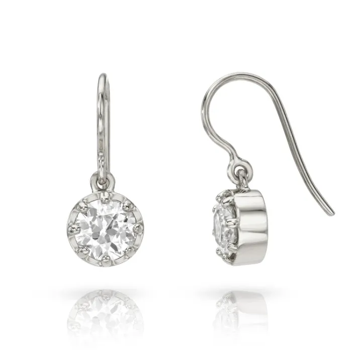 1.66ctw J-K/SI2 GIA certified old European cut diamonds prong set in handcrafted platinum drop earrings.
