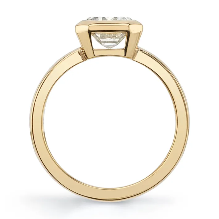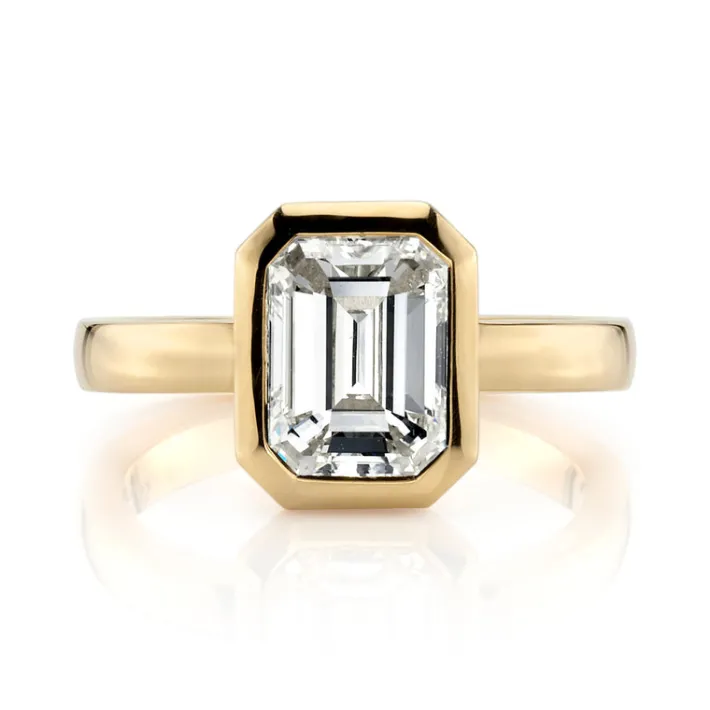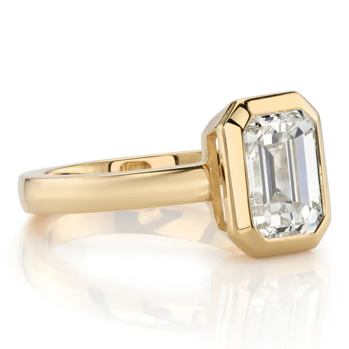 2.03ct N/VS1 GIA certified emerald cut diamond bezel set in a handcrafted 18K yellow gold mounting.