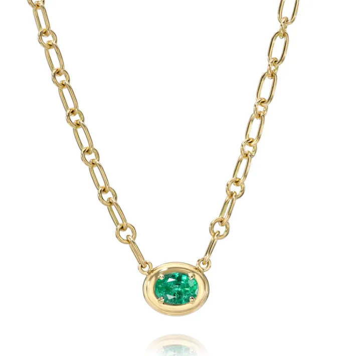 1.01ct GIA certified Zambian oval cut green emerald prong set on our handcrafted 18K yellow gold Mini Lo chain.