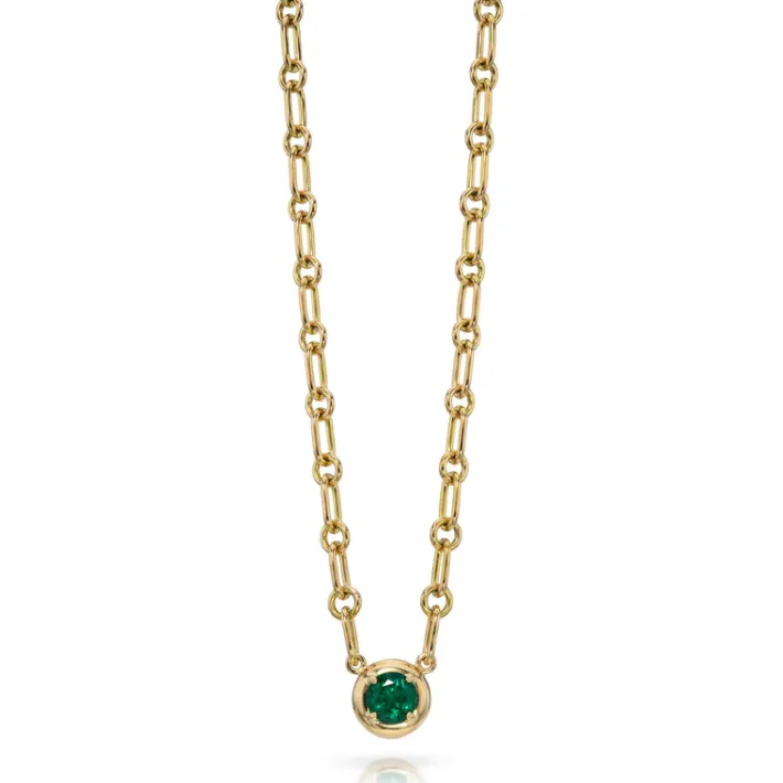 0.58ct round cut green emerald prong set on our handcrafted 18K yellow gold Mini Lo chain.