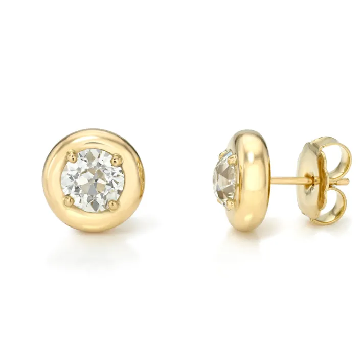 3.14ctw L-M/SI1-SI2 GIA certified old European cut diamonds prong set in handcrafted 18K yellow gold stud earrings.