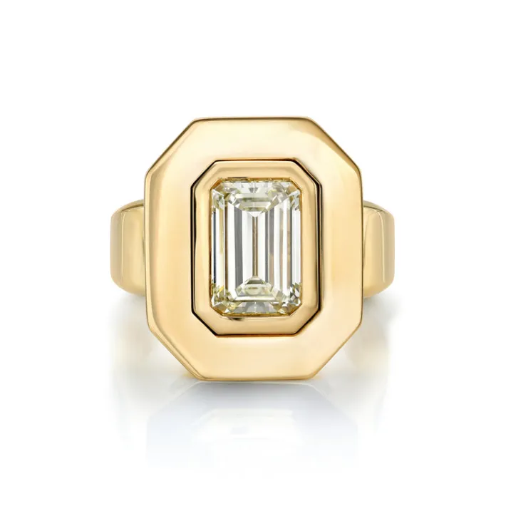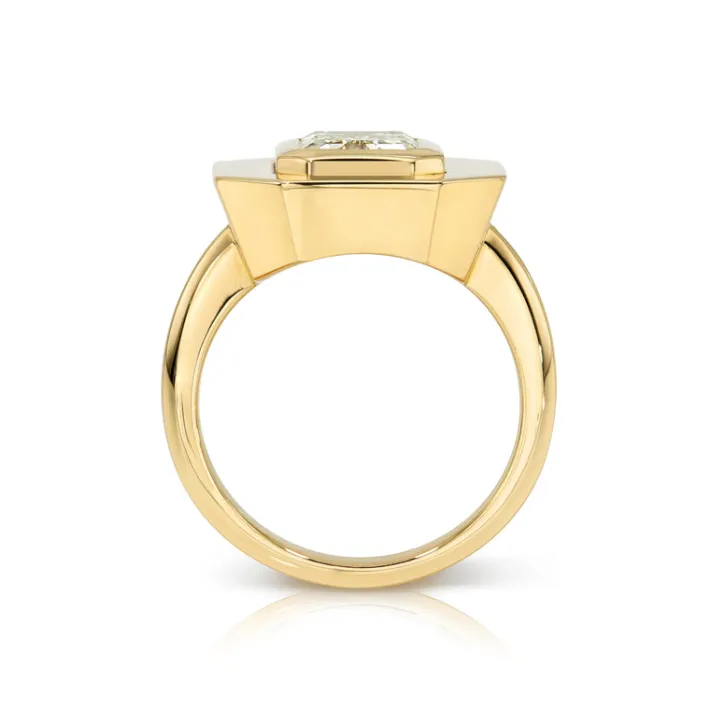 2.39ct W-X/VVS2 GIA certified emerald cut diamond bezel set in a handcrafted 18K yellow gold mounting.