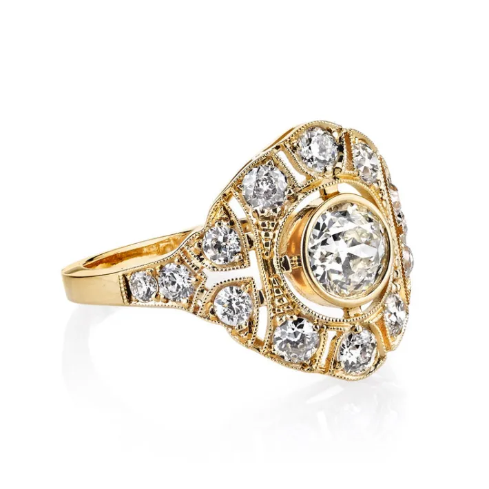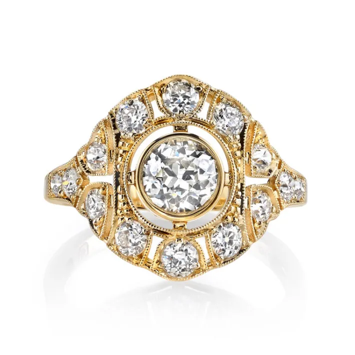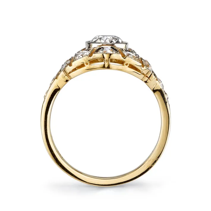 0.66ct L/VS2 GIA certified old European cut diamond with 0.65ctw old European cut accent diamonds set in a handcrafted 18K yellow gold mounting.