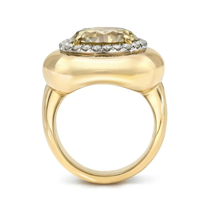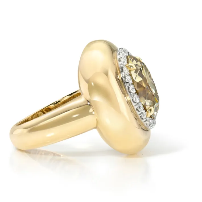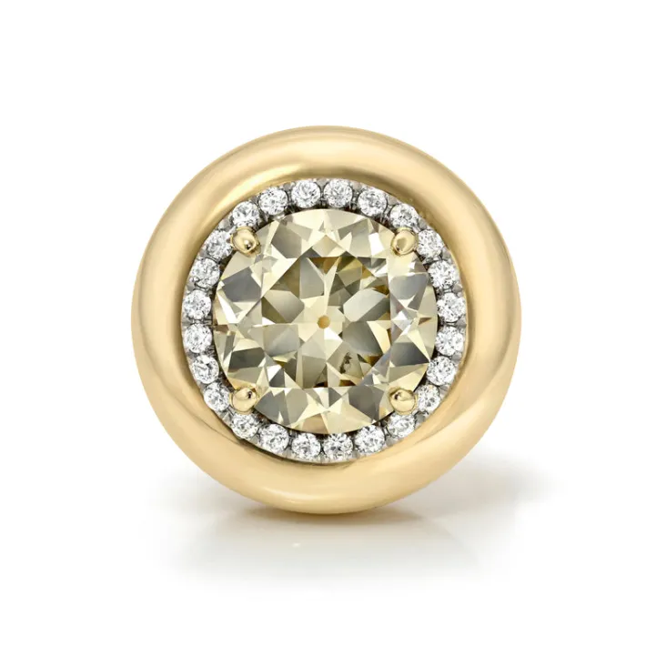 6.25ct Fancy Brown Yellow/SI2 GIA certified old European cut diamond prong set in a handcrafted 18K yellow gold mounting, surrounded by a platinum halo featuring 0.37ctw pavé set old European cut accent diamonds .