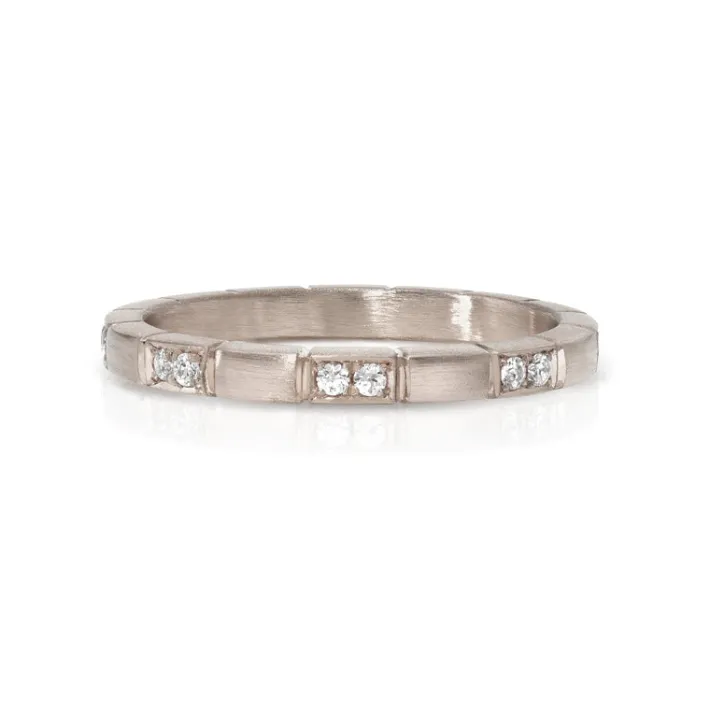 Handcrafted 2.2mm satin finish band with alternating sections featuring 0.15ctw old European cut diamonds.