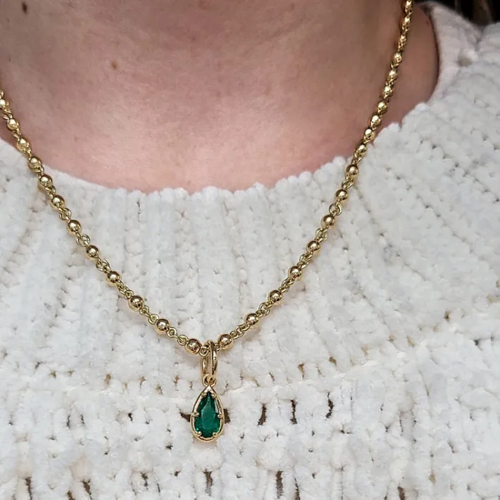 0.76ct pear shape green emerald prong set in a handcrafted, hand engraved 18K yellow gold drop pendant.Price does not in…