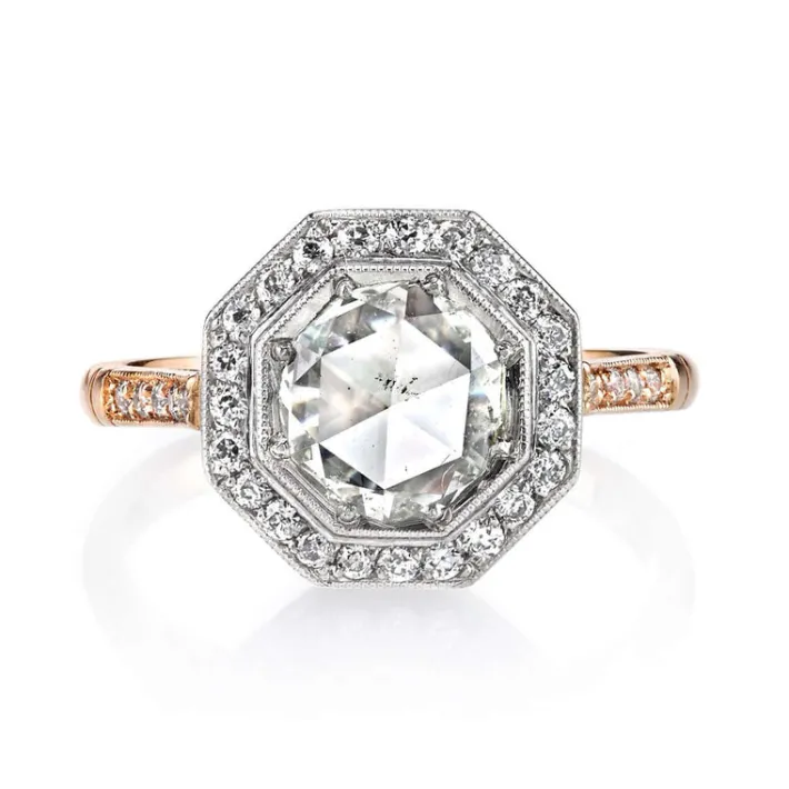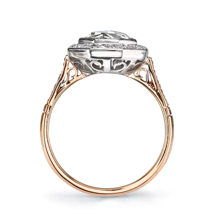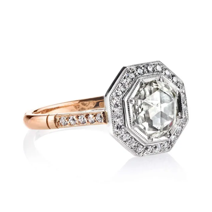 0.92ct Light Yellow/SI2 rose cut diamond with 0.31ctw old European cut accent diamonds set in a handcrafted 18K rose gold and platinum mounting.
