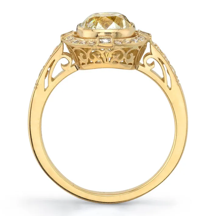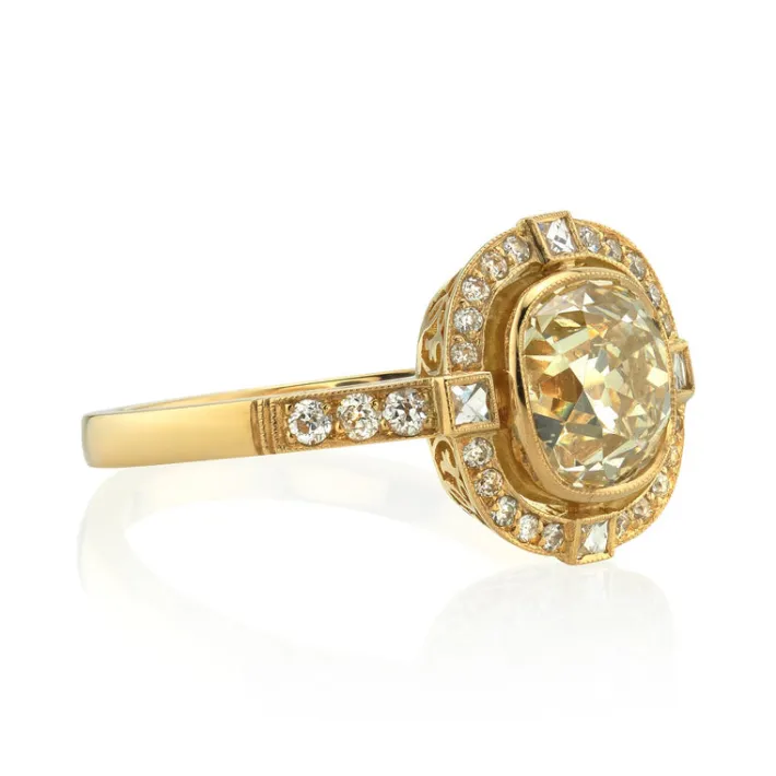 1.73ct K/SI1 EGL certified antique cushion cut diamond with 0.18ctw old European cut accent diamonds and 0.06ctw French cut accent diamonds set in a handcrafted 18K yellow gold mounting.