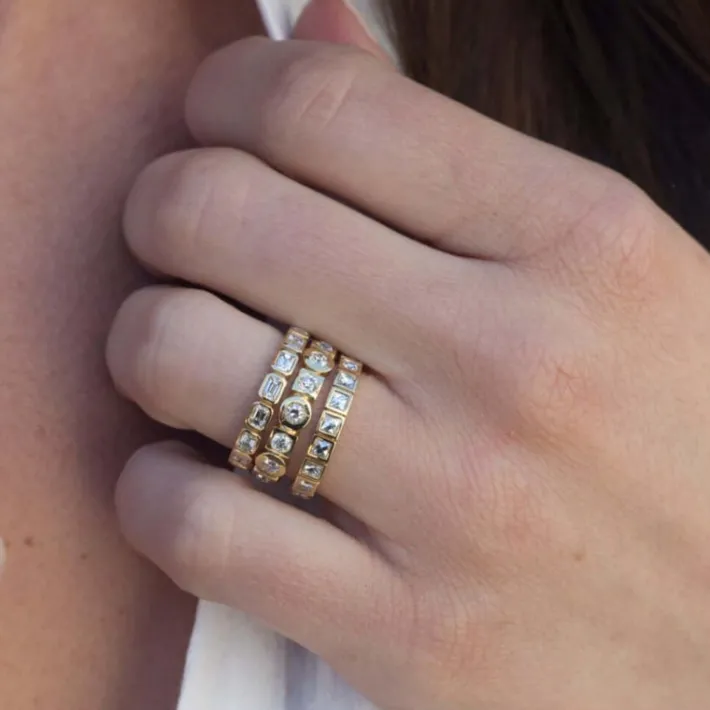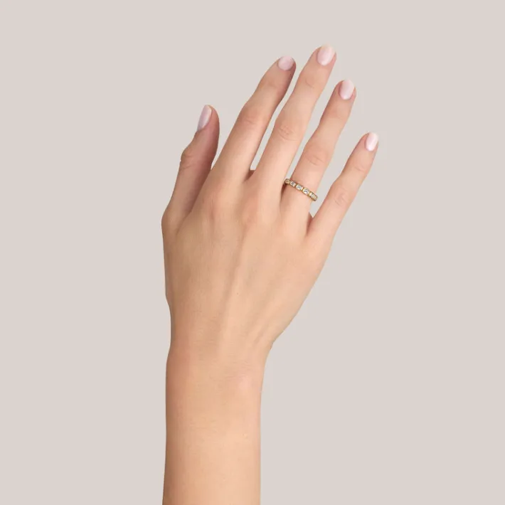 Approximately 1.40ctw H-I/VS emerald cut diamonds bezel set in a handcrafted eternity band.