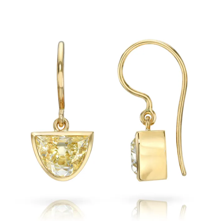 3.11ctw O-P,S-T/SI1-SI2 GIA certified half-moon cut diamonds bezel set in handcrafted 18K yellow gold drop earrings.