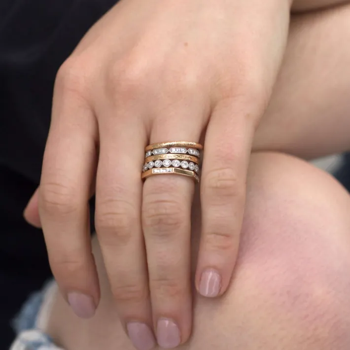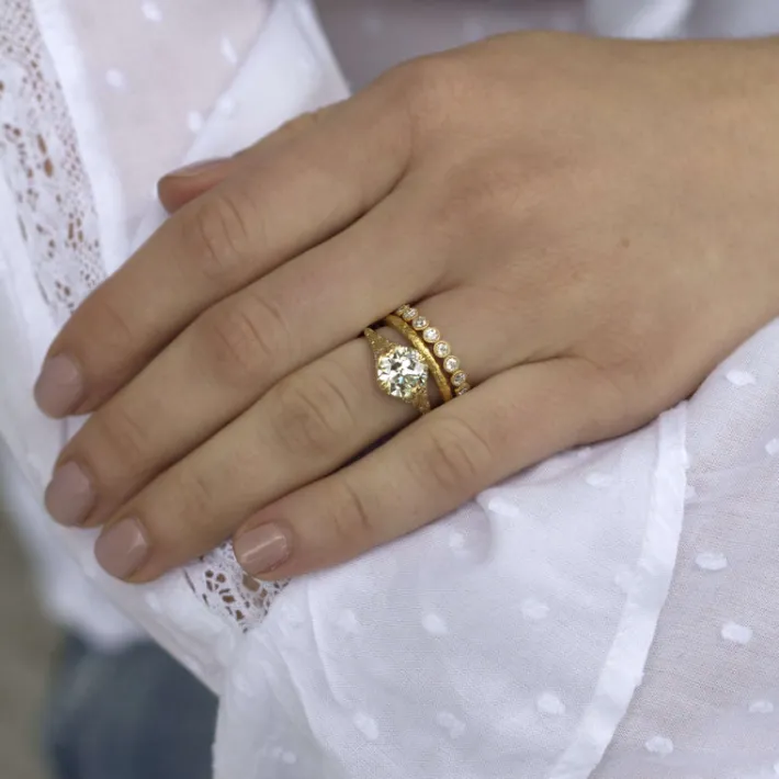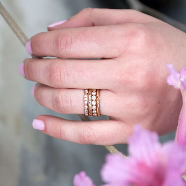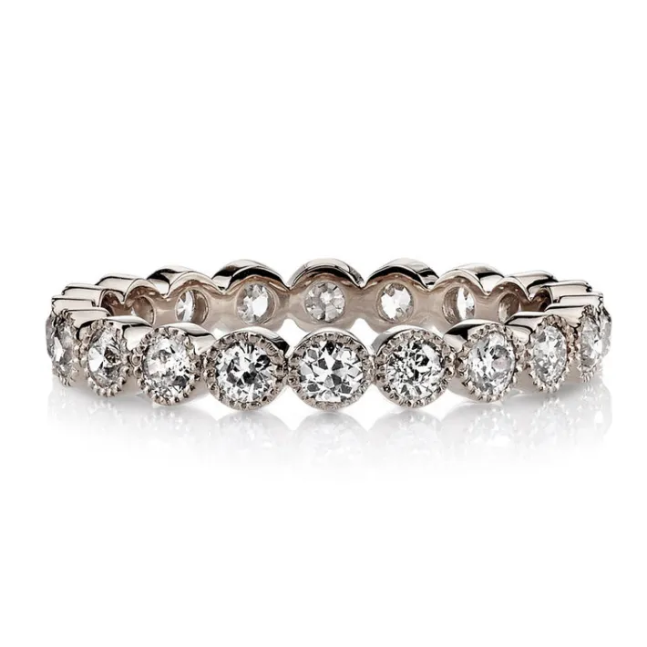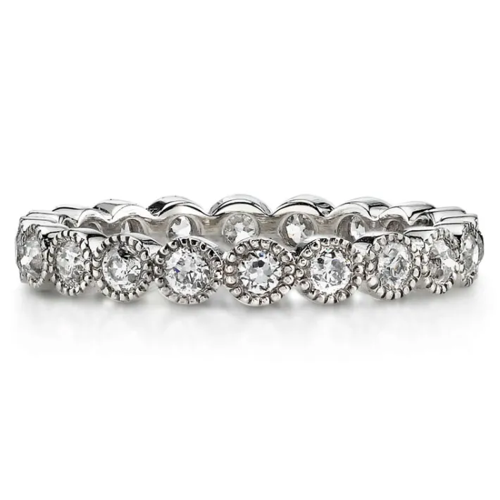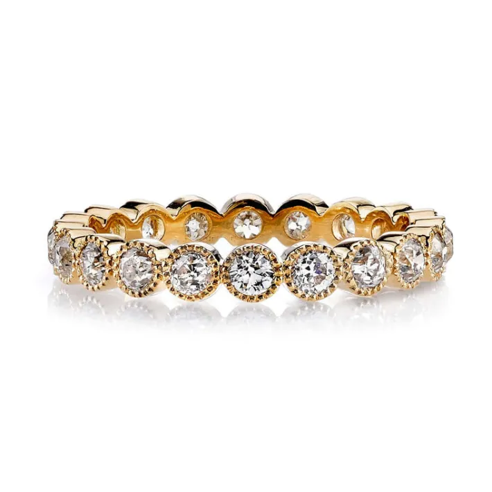 Approximately 1.00ctw G-H/VS old European cut diamonds bezel set in a handcrafted eternity band.