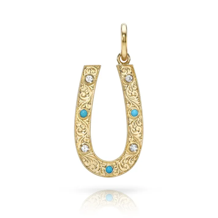 Approximately 0.14 – 0.16ctw old European cut diamonds featuring three turquoise cabochon accent stones bezel set in a handcrafted, hand engraved, 18K yellow gold horseshoe shaped pendant.