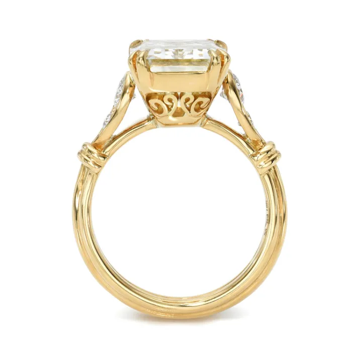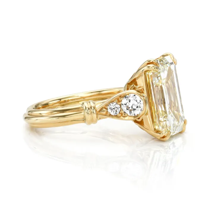 Emerald cut diamond with old European cut accent diamonds prong set in a handcrafted 18K yellow gold mounting.