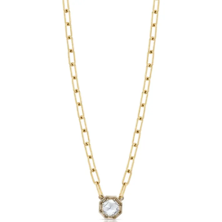 0.73ct H/SI1 GIA certified rose cut diamond prong set in an 18K champagne white gold pendant on our handcrafted 18K yellow gold Bond chain.