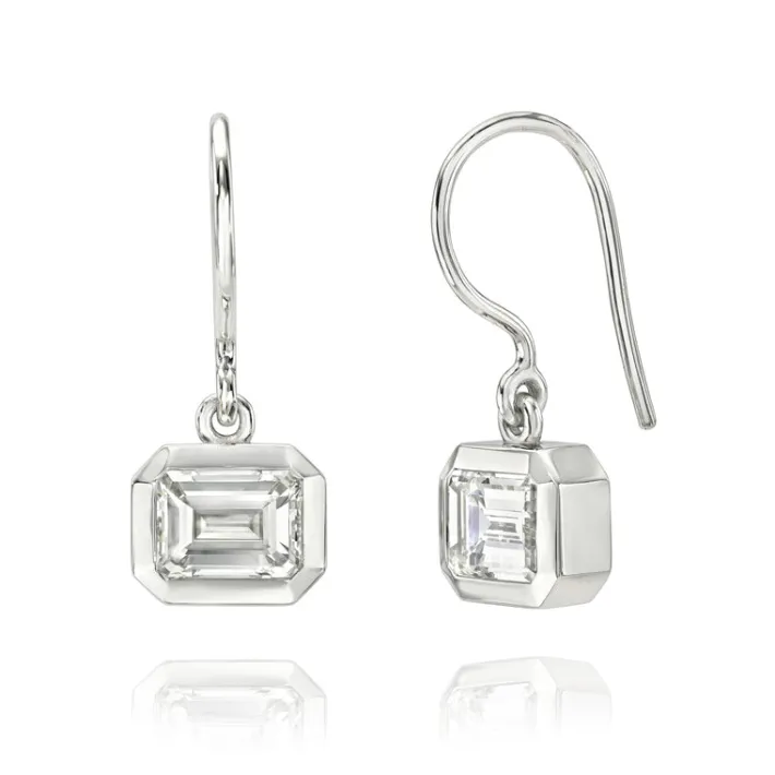 2.02ctw K/VS1-VVS2 GIA certified emerald cut diamonds bezel set in handcrafted platinum drop earrings.
