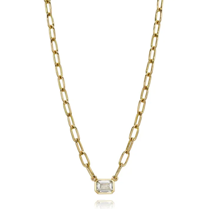 0.71ct S-T/VVS2 GIA certified emerald cut diamond bezel set on our handcrafted 18K yellow gold Bond chain.Necklace measu…