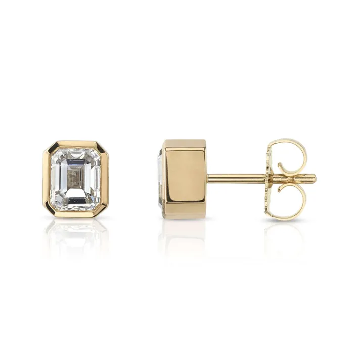 2.01ctw J-L/VS1-SI1 GIA certified emerald cut diamonds bezel set in handcrafted 18K yellow gold stud earrings.