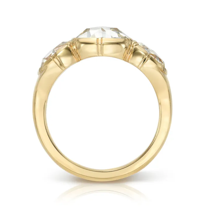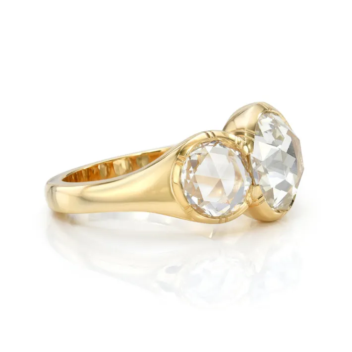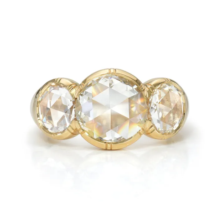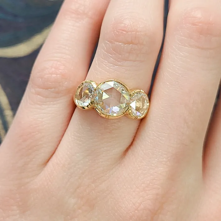 1.41ct L/SI1 GIA certified antique round rose cut diamond with 1.41ctw H-L/VS2-SI1 GIA certified rose cut accent diamonds bezel set in a handcrafted 18K yellow gold mounting.