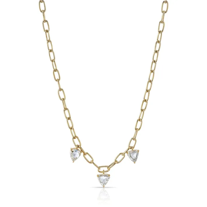 1.32ctw J-K/VS-SI fancy cut diamonds prong set on our handcrafted 18K yellow gold Bond chain.