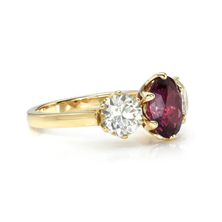 1.83ct oval cut ruby with 1.59ctw L-M/VS1-VS2 GIA certified old European cut accent diamonds prong set in a handcrafted …