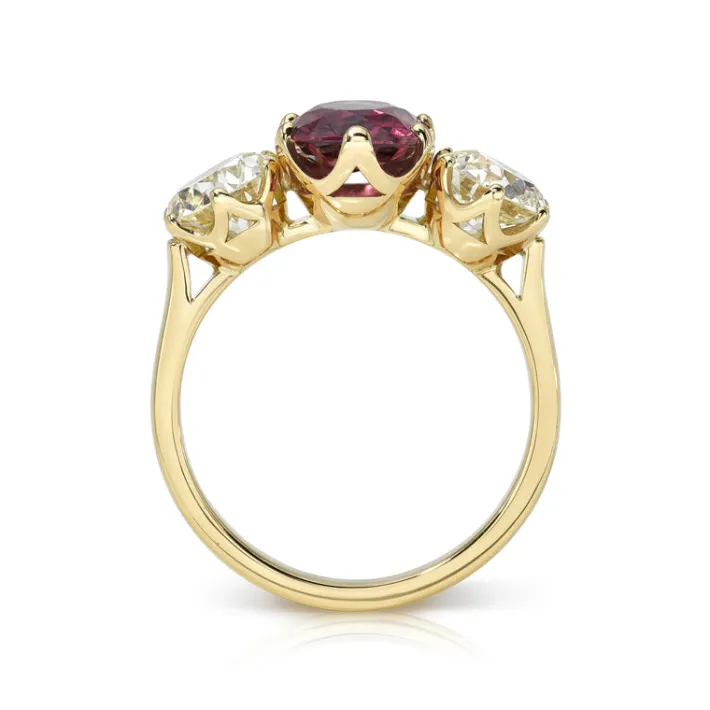 1.83ct oval cut ruby with 1.59ctw L-M/VS1-VS2 GIA certified old European cut accent diamonds prong set in a handcrafted 18K yellow gold mounting.