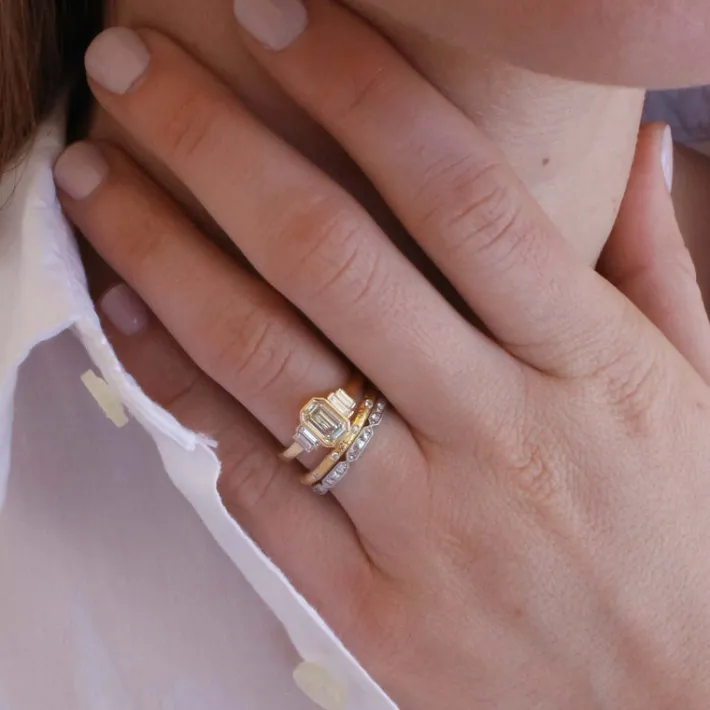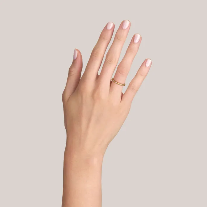 Approximately 0.10ctw G-H/VS old European cut diamonds set in a handcrafted 22K yellow gold hammer finished band.