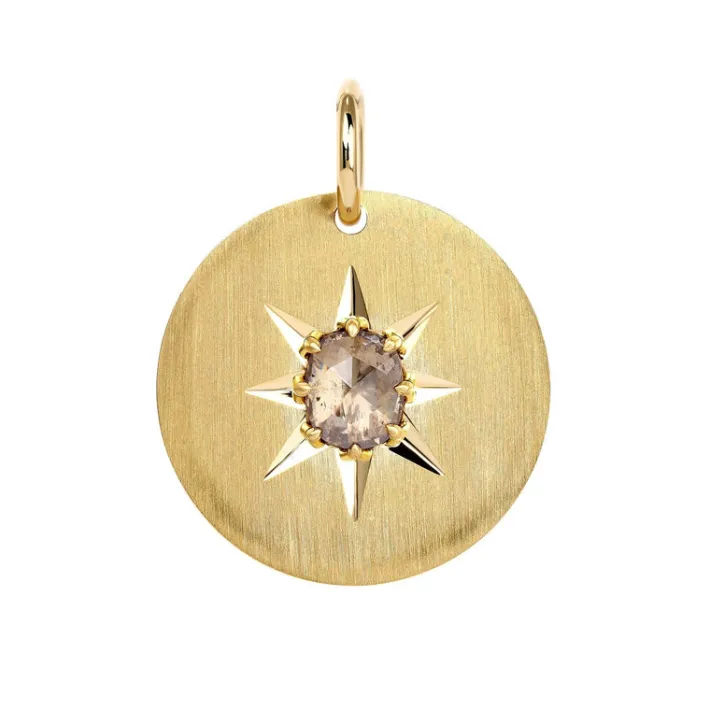 0.93ct Brown/I1 mixed antique cushion cut/rose cut diamond prong set on a handcrafted 25mm 18K yellow gold round disc pendant.